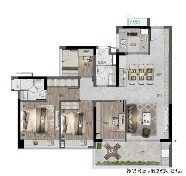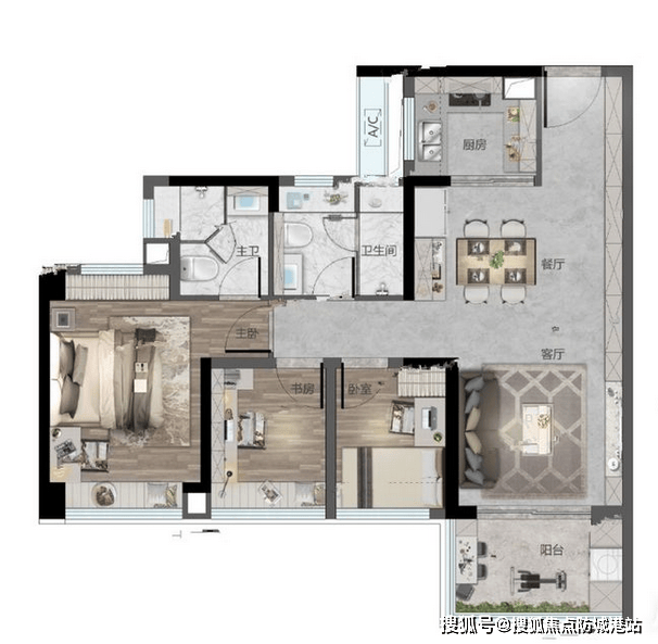 更贴心的是,主卧带有270°阳台,这个设计真的太戳人了!平时在阳台摆个小茶桌,看看书、喝喝茶,或者摆放几盆绿植,闲暇时欣赏一下窗外的风景,放松身心,简直是“神仙生活”;而且270°的视野,采光和观景效果都极佳,晚上还能看看夜景,十分惬意。据项目官方公布,这款户型的得房率大概在85%左右,在同面积段户型中属于偏高的,没有太多浪费空间,每个区域都利用得十分合理,客厅宽敞明亮,卧室大小适中,卫生间干湿分离,实用性拉满。