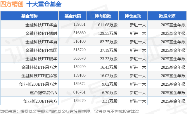 根据2025基金年报公募基金重仓股数据,重仓该股的公募基金共15家,其中持有数量最多的公募基金为华宝基金的金融科技ETF华宝。金融科技ETF华宝目前规模为100.84亿元,最新净值0.7121(4月9日),较上一交易日下跌3.01%,近一年上涨8.97%。该公募基金现任基金经理为陈建华 曹旭辰。陈建华在任的基金产品包括:华宝中证A100ETF联接A,管理时间为2012年12月22日至今,期间收益率为176.37%;化工ETF华宝,管理时间为2021年2月26日至今,期间收益率为-4.5%;有色ETF华宝,管理时间为2021年3月12日至今,期间收益率为118.46%。曹旭辰在任的基金产品包括:通用航空ETF华宝,管理时间为2025年5月22日至今,期间收益率为20.12%;创业板人工智能ETF华宝,管理时间为2025年5月22日至今,期间收益率为148.85%;港股互联网ETF华宝,管理时间为2025年5月22日至今,期间收益率为-16.59%;电子ETF华宝,管理时间为2025年5月22日至今,期间收益率为54.9%。